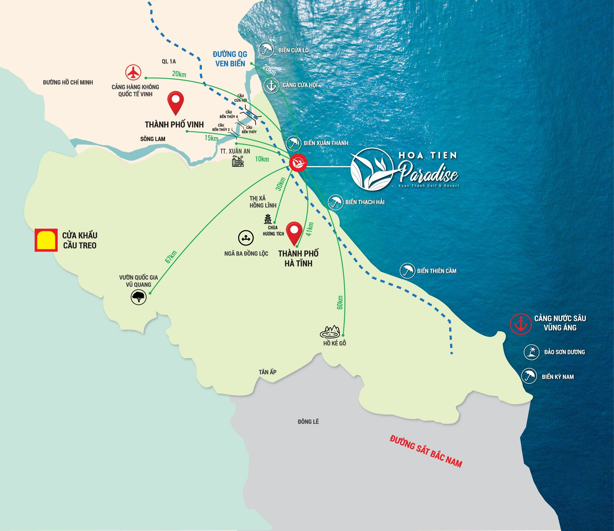 Hoa Tiên Paradise là dự án khu đô thị nghỉ dưỡng biển hấp dẫn nhất Bắc Trung Bộ. dự án có quy mô lên đến 121 ha, với đa dạng các tiện ích dịch vụ giải trí như: sân golf 18 lỗ, trường đua chó, khu cắm trại Hoa Nắng Camping Beach, sân tennis, phòng tập gym & spa, hệ thống nhà hàng, khách hạn cao cấp, bể bơi vô cực rộng lớn. Đi cùng với những tiện ích ấy là những sản phẩm kinh doanh và nghỉ dưỡng lý tưởng, như Shophouse, Biệt thư Biển và Shop Villa.